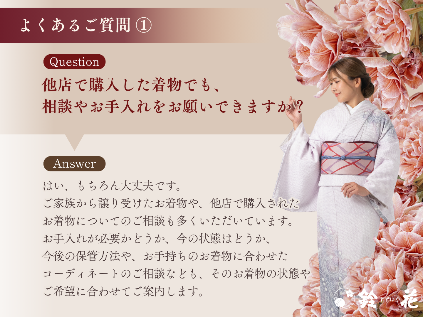 「着物、初めてなんです」という方も大歓迎!一緒に「運命の一枚」を探すお手伝いをさせてください。もちろん、着物好きさんも大歓迎です。
