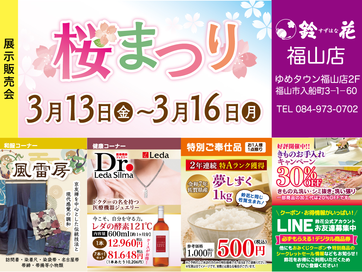「日本の美と伝統を継承するお店」として素敵な着物ライフのお手伝いができればと思います。せび気軽に鈴花福山店に遊びに来てくださいね。