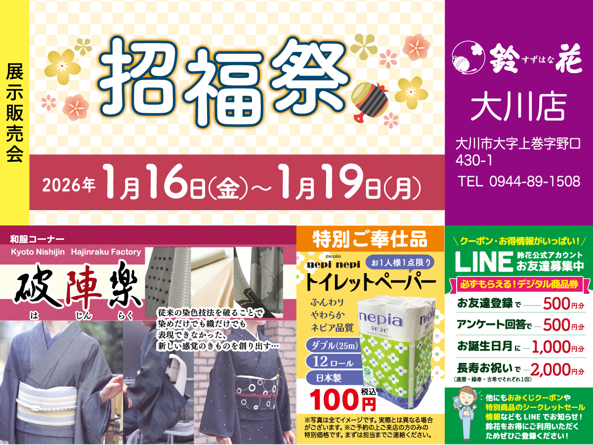 多くのお客様に気軽に立ち寄ってもらえる、着物を着て、見て楽しかったと言って頂けるイベントも開催しておりますのでどうぞお気軽にお立ち寄りください。